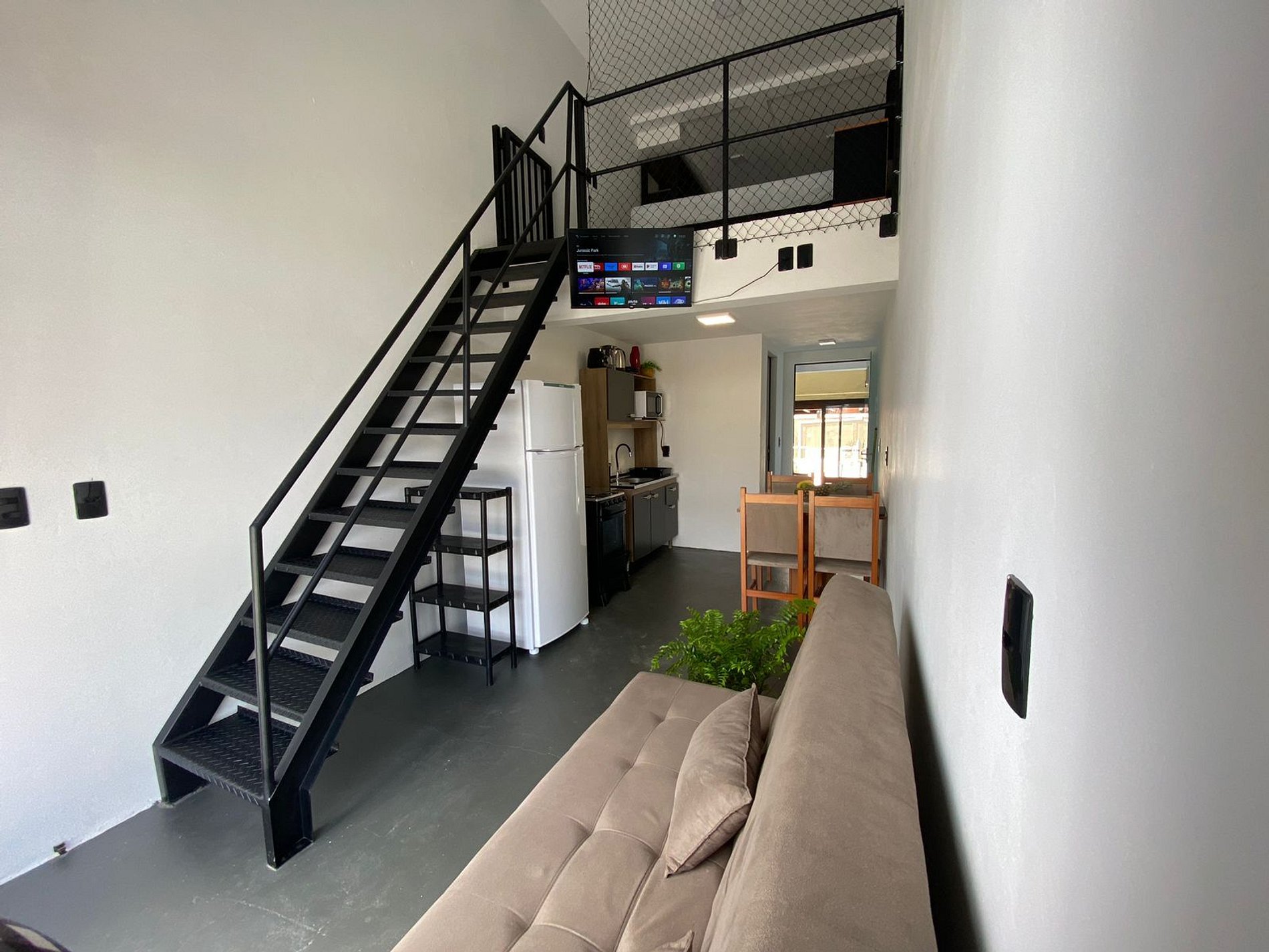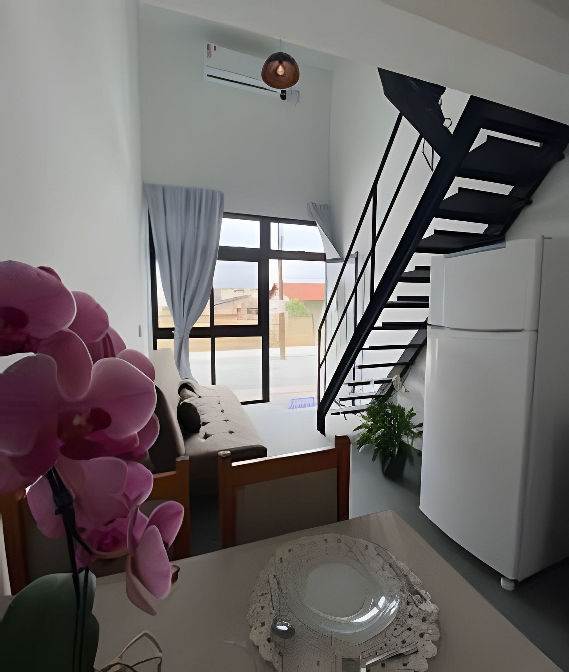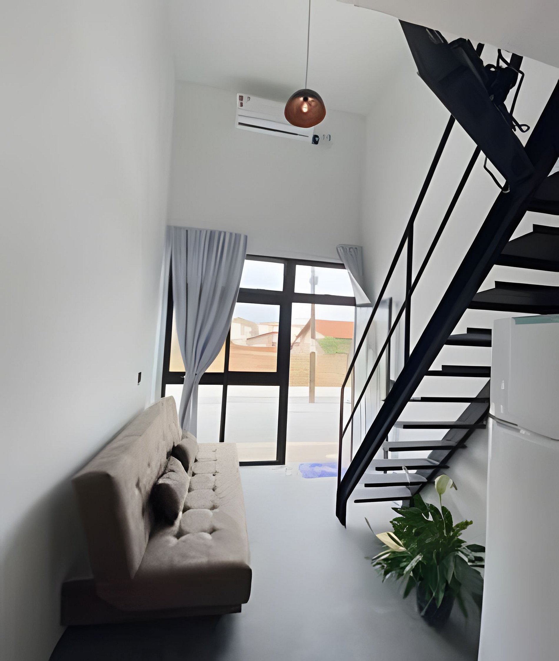 Primeiro piso tem o banheiro, a cozinha e a sala conjugada com TV e um sofá cama, subindo a escada temos o mezanino com uma cama de casal e uma cama de solteiro com auxiliar, um espaço para roupas aberto e esse mezanino não possui porta, porém possui a rede de segurança e um portão no topo da escada para maior conforto e segurança dos hóspedes acompanhados de crianças.