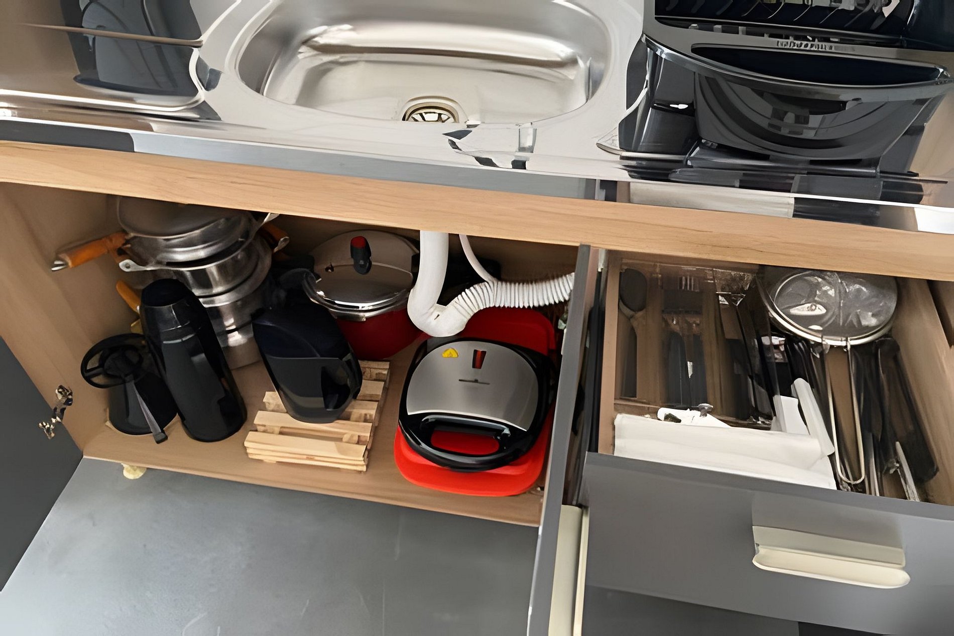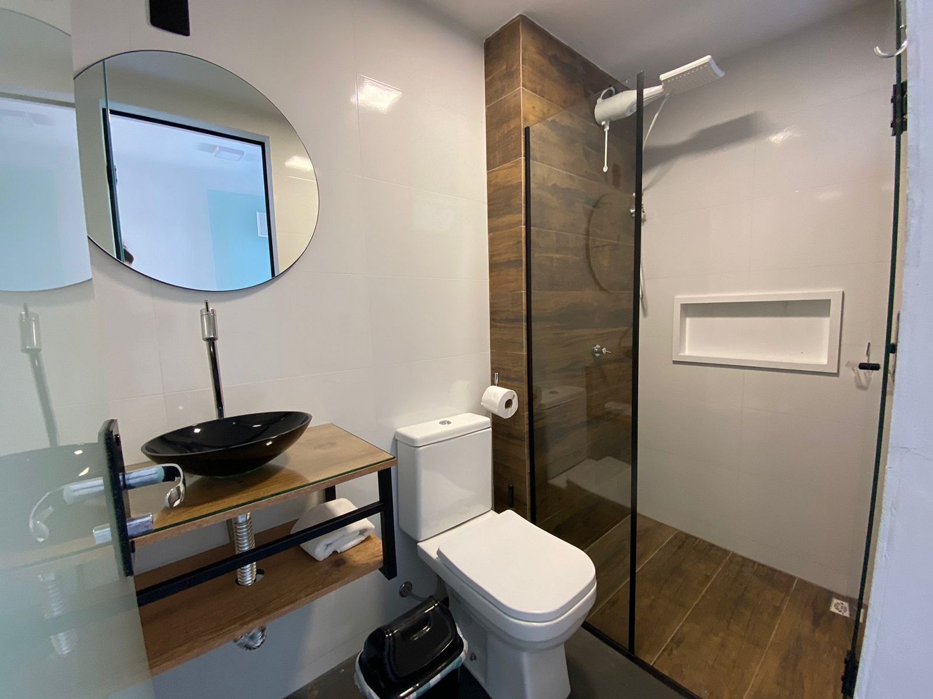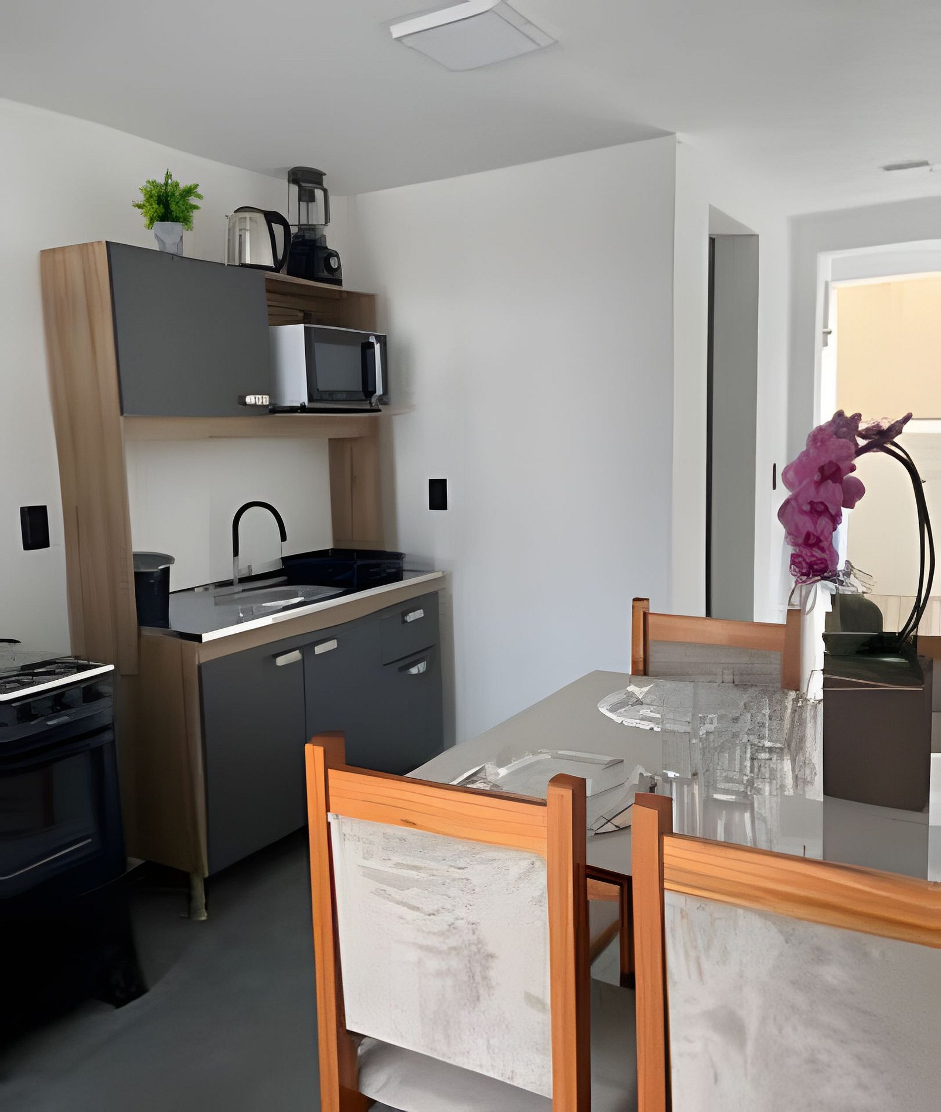 Primeiro piso tem o banheiro, a cozinha e a sala conjugada com TV e um sofá cama, subindo a escada temos o mezanino com uma cama de casal e uma cama de solteiro com auxiliar, um espaço para roupas aberto e esse mezanino não possui porta, porém possui a rede de segurança e um portão no topo da escada para maior conforto e segurança dos hóspedes acompanhados de crianças.